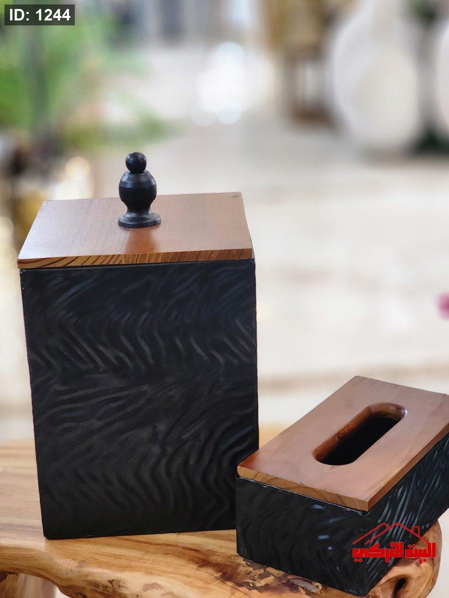 سطل مع علبة محارم معدن مطلي اسود غطاء خشب