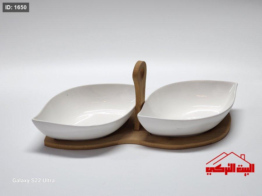 صحن بورسلان ابيض قاعدة خشب