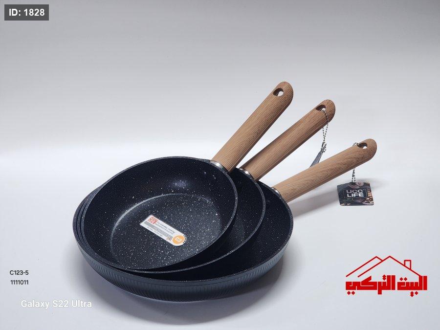 طقم 3قلايات جرانيت موزع حراري يد خشبي