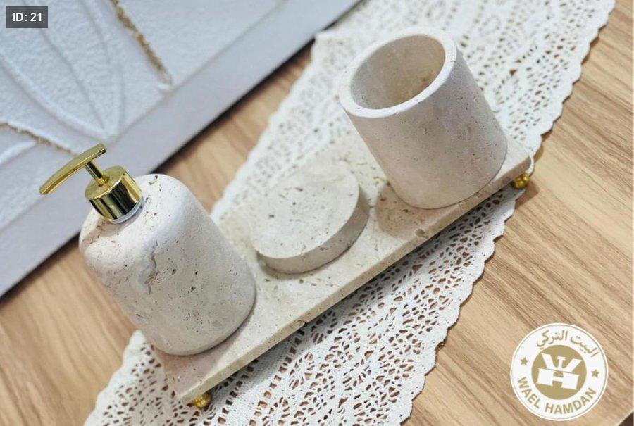 يتكون من 4 قطع (صينية ، علبة موزع صابون ، حمالة صابون ، علبة فرشاة أسنان )