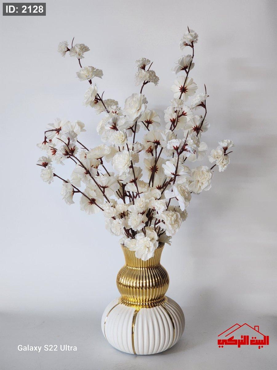 مزهرية زجاج ابيض محزز ذهبي مع ورد نوار