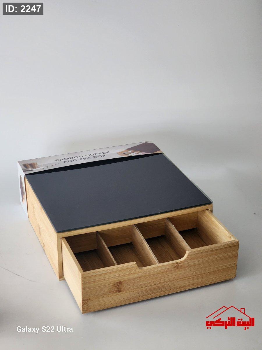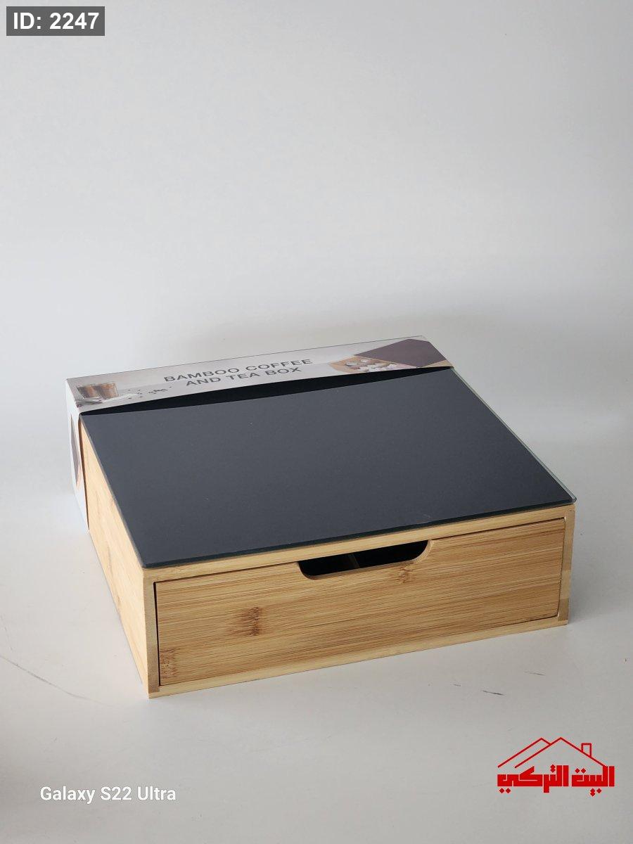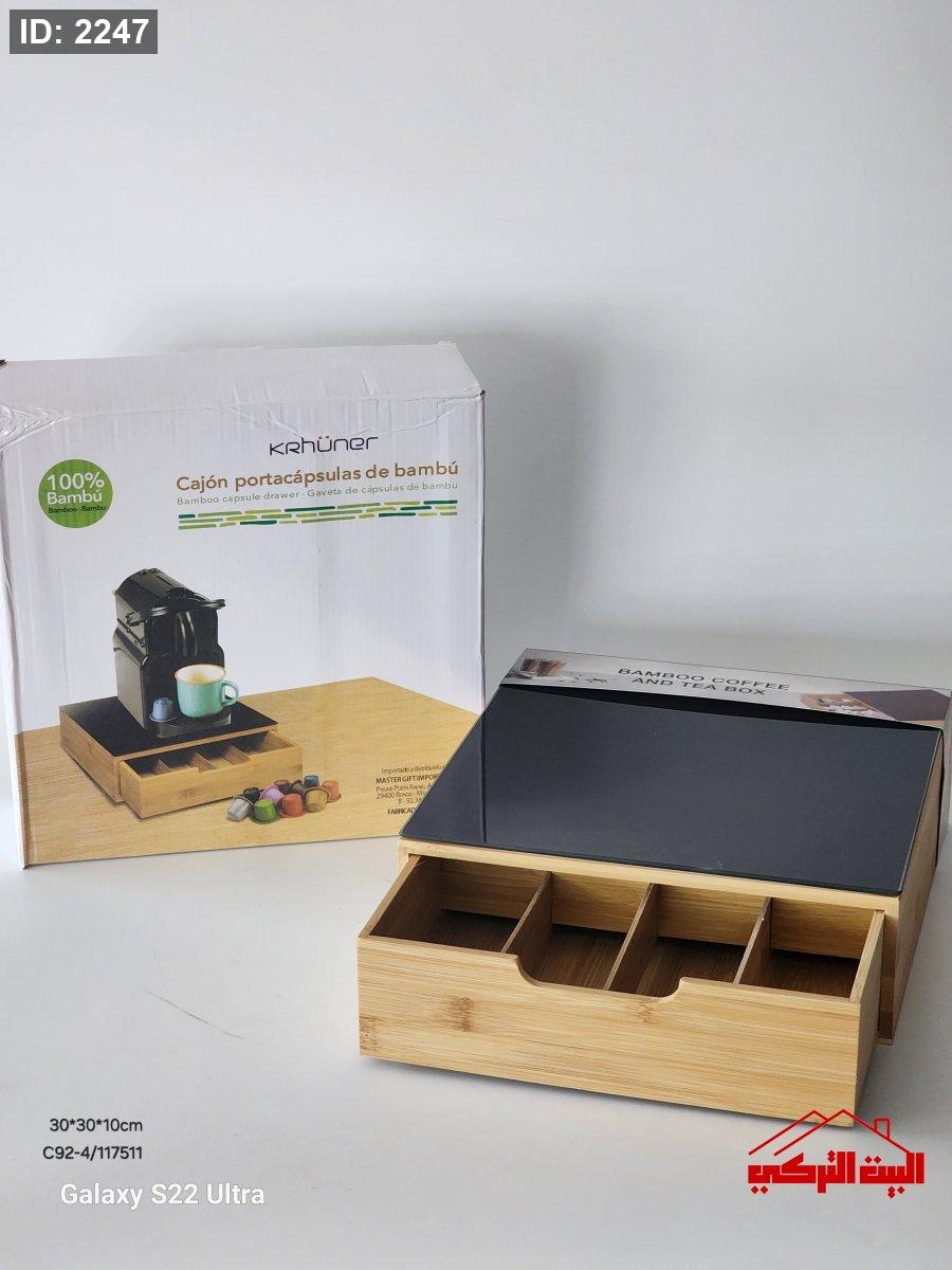 ستاند خشب بامبو وجه زجاج اسود لماكنة صنع القهوة مع جارور سحب للكبسولات30*30*10سم