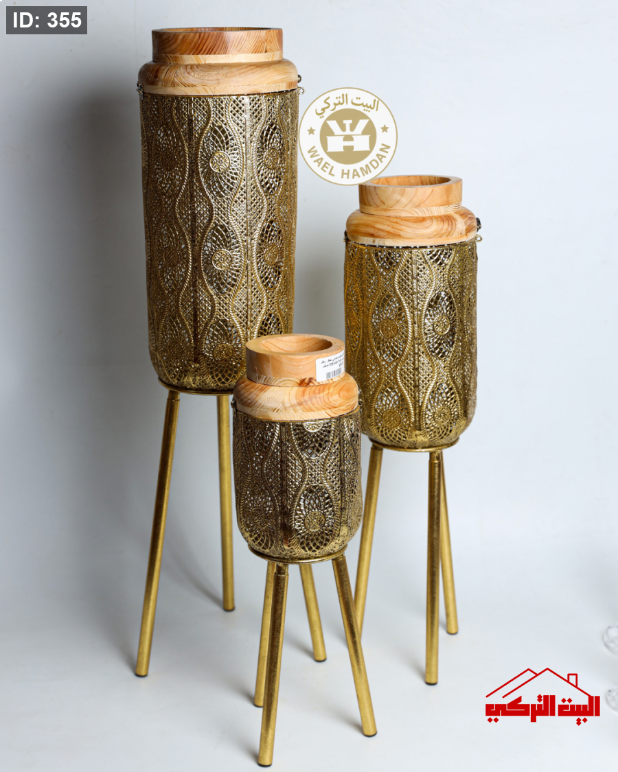 طقم شمعدان و فانوس خشب و ذهبي